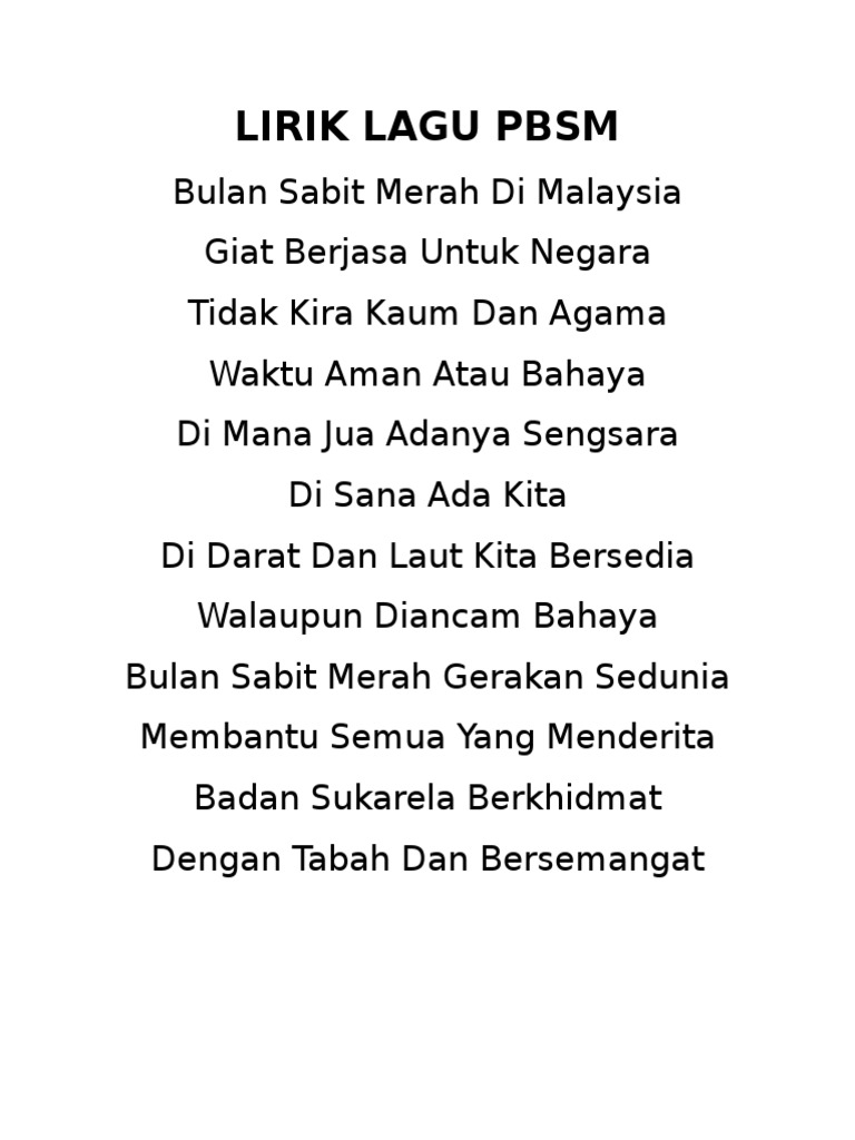 LIRIK LAGU PBSM Bulan Sabit Merah Di Malaysia Giat Berjasa Untuk Negara Tidak Kira Kaum Dan Agama Waktu Aman Atau Bahaya Di Mana Jua Adanya Sengsara Di Sana Ada Kita Di. Lirik lagu pbsm bulan sabit merah di. Persatuan bulan sabit merah malaysia bsmm adalah satu pertubuhan bukan untung.